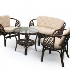 Комплект из натурального ротанга, состоящий из двух кресел и круглого столика с плетеной столешницей. Стекло входит в комплект.
