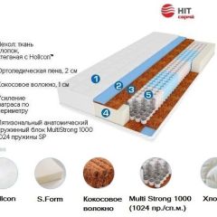 Multi Strong 1000 (1024 пр./сп.м.) Независимый 5-ти зональный пружинный блок, в котором на одно спальное место приходится около 1024 пружин. 5 зон поддержки для головы, плеч, бедер, ног и ступней обеспечиваются пружинами разной жесткости (разница в диаметре стальной проволоки из которой они изготавливаются: 1,8 мм и 1,9 мм). Диаметр пружины 4,5 см, высота 14 см. Пружины упакованы в специальный «карманы» из нетканого материала синего и белого цветов (цвет определяет зональность).