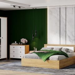 Модульная спальня «Милан» — это очень стильное решение. Она выполнена из качественных материалов — ЛДСП в цвете Дуб Золотой и Белого матового МДФ, что гарантирует долговечность и прочность. Фасады имеют качественную и красивую фрезеровку, которая придаёт спальне изысканность и элегантность.